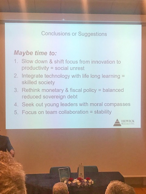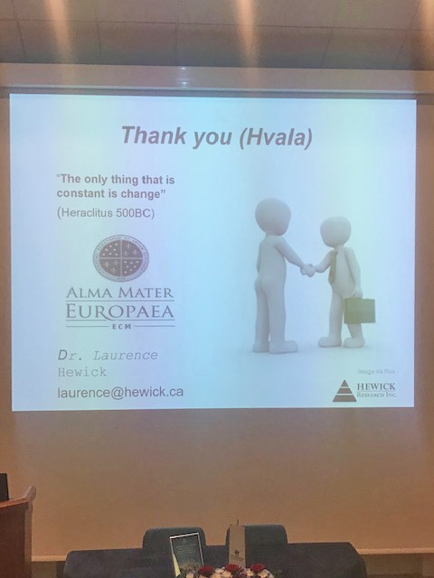 Prof. Hewick je predaval o pogledu na globalno ekonomijo ter jo primerjal z razvojnimi trendi v Sloveniji. Na konfereci, ki jo organizira Svetovni slovenski kongres pod pokroviteljstvom predsednika vlade Marjana Šarca, nastopajo vrhunski znanstveniki in ugledni gospodarstveniki iz Slovenije in tujine. Prof. Hewick se je s ponosom predstavil kot profesor Alma Mater Europaea.