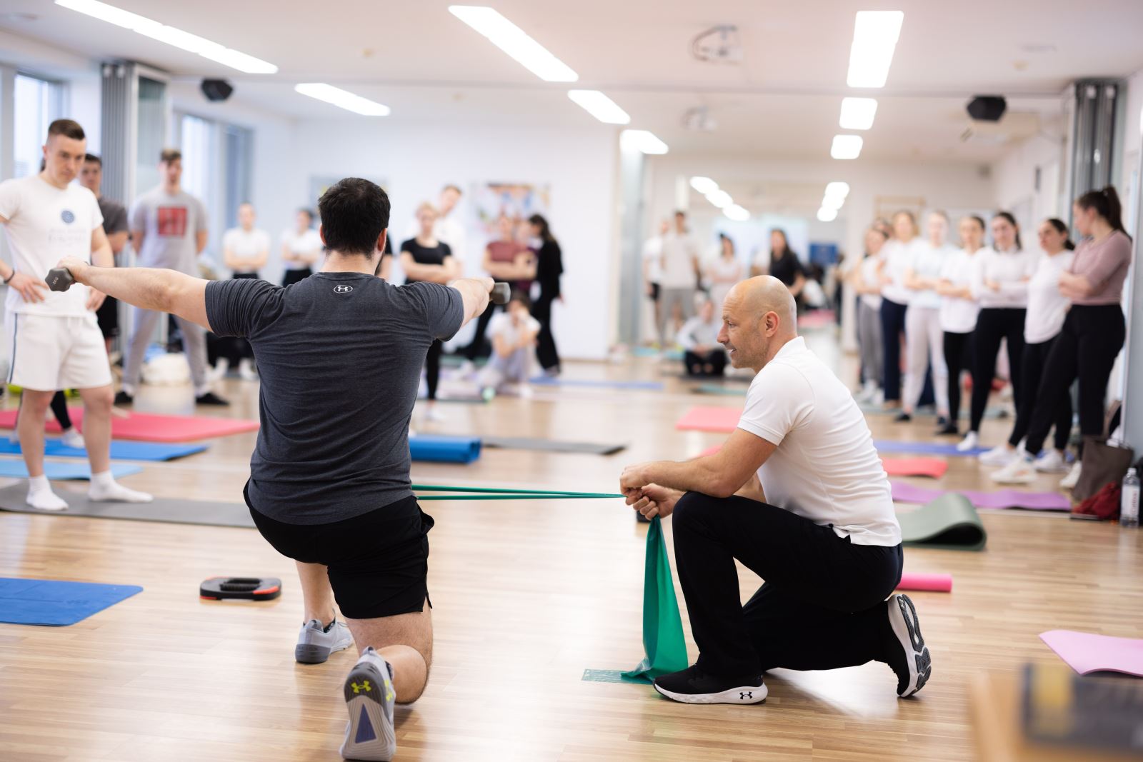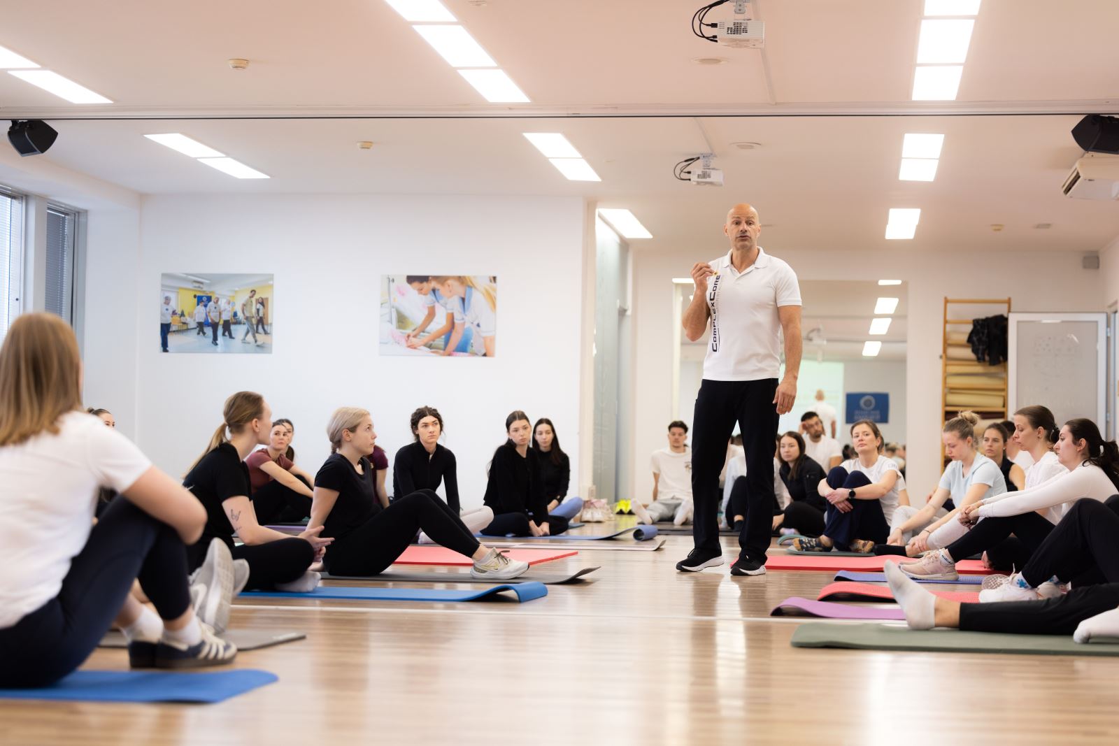 Z številnimi navdušenimi udeleženci je delil praktične pristope mobilizacije, stabilizacije, funkcionalnega treninga, aktivne vadbene terapije in individualiziranih rehabilitacijskih procesov. Posebej je izpostavil pomen osnovnih gibalnih komponent: gibljivosti, fleksibilnosti, stabilnosti, moči, propriocepcije in koordinacije, ki so pogosto zanemarjene v enostranskih treningih, kar vodi v kompenzacijske vzorce in preobremenitve določenih struktur.
